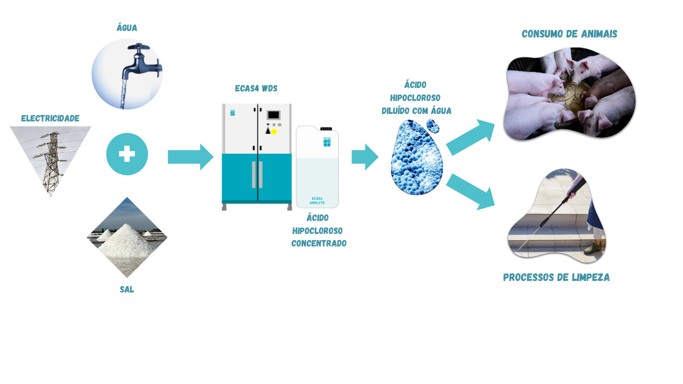 Ao contrário do cloro tradicional, que requer o manuseamento de químicos perigosos, liberta facilmente cloraminas e corrói as suas bombas e tubagens, a tecnologia ECAS4 produz um desinfetante de pH neutro. Isto significa que obtém uma água mais pura do que nunca, e garantindo a máxima segurança para os seus animais e colaboradores.